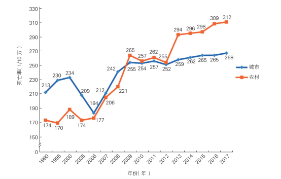 2017年心血管病死亡率仍居首位,農(nóng)村和城市心血管病分別占死因的45.91%和43.56%。