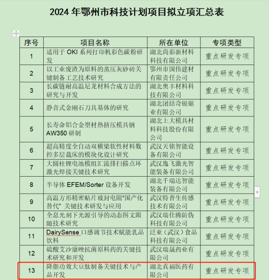 近日,鄂州市科學(xué)技術(shù)局正式發(fā)布了《2024年鄂州市科技計(jì)劃項(xiàng)目擬立項(xiàng)項(xiàng)目公示》。我司以自主研發(fā)的“降脂功效大豆肽制備關(guān)鍵技術(shù)與產(chǎn)品開(kāi)發(fā)”項(xiàng)目榮獲重點(diǎn)研發(fā)專(zhuān)項(xiàng)。
